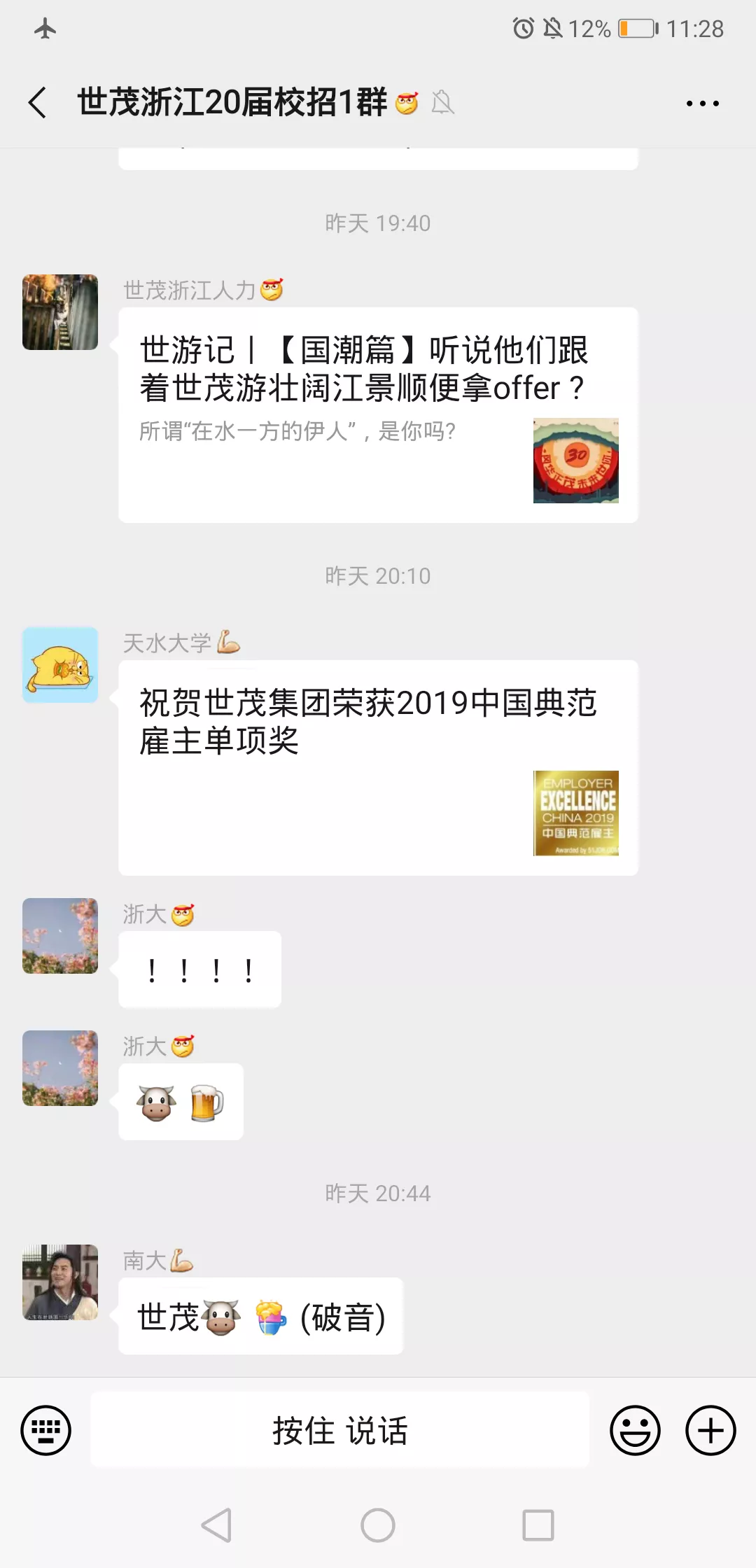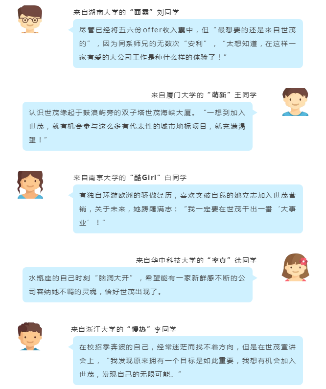 而除了高居不下的现场人气,各大高校的球王会体育在线校招群里也热闹非凡,不断上演着“爆灯打call”的情节,大家妙语成珠,争相发表着精彩的“入世宣言”。