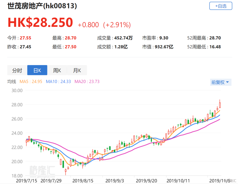 格隆汇11月5日丨球王会体育在线房地产(0813.HK)涨近3%,报28.25港元,盘中高见28.7港元,股价创其2006年上市以来新高,成交1.28亿港元,总市值达到932.67亿港元。