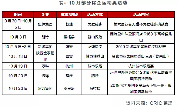 10月,戈壁徒步、登山、跑步、骑行等成为不少房企热衷的活动,该类运动不仅有利于加强房企内部团队的凝聚力及向心力,也有利于树立企业良好社会形象。