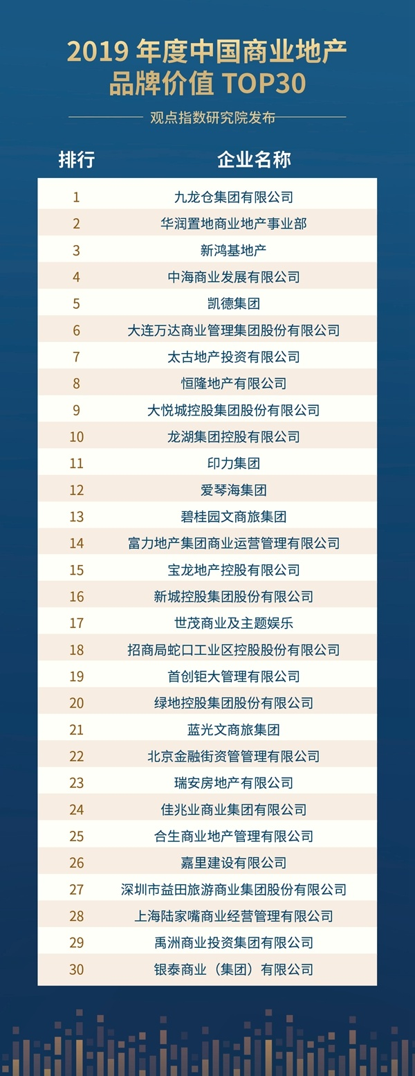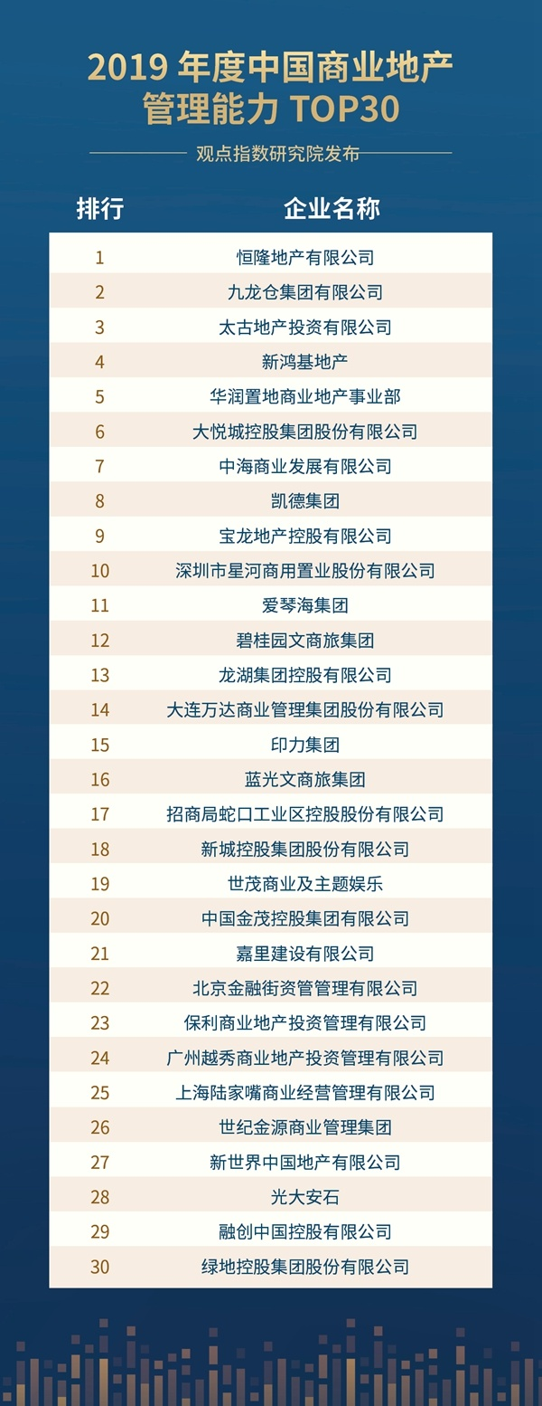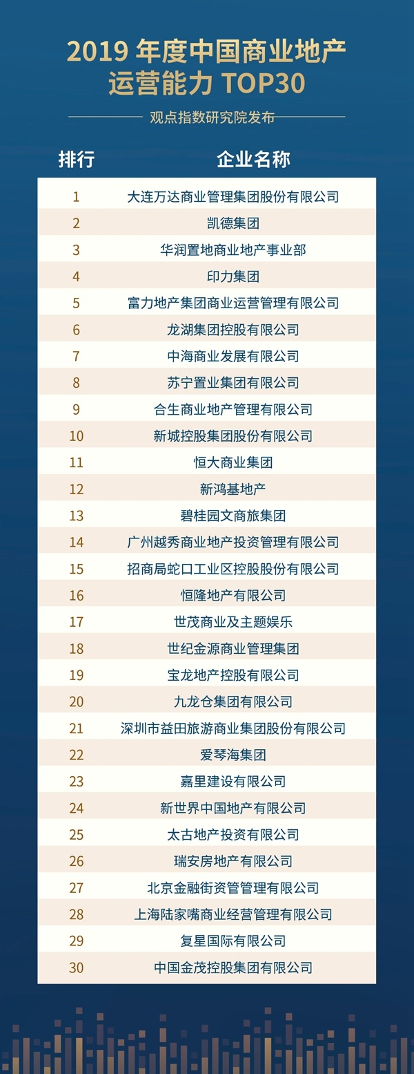 2019年度中国商业地产运营能力TOP30,旨在评选和表彰2019年度中国商业地产领域中具有杰出运营能力的企业。作为分榜单,本榜单从企业投资物业收益、投资物业资产值、区域布局等各维度综合评选表现出色的企业。