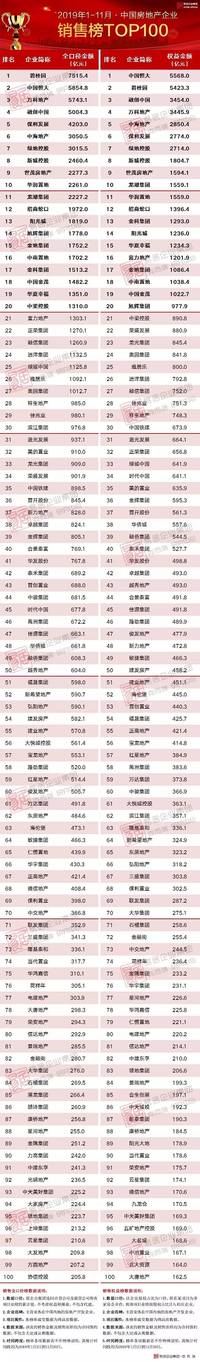 自2019年1月起,在原有的销售流量榜和权益榜的基础上,我们新增了销售全口径榜。销售全口径,是指把企业集团连同合营及联营公司所有项目计入业绩的统计方式,不考虑权益比例和是否操盘。由于代建属于输出管理行为,在全口径榜单数据中统一不包括代建产生的销售业绩。全口径榜反映的是企业城市布局和项目拓展的能力。