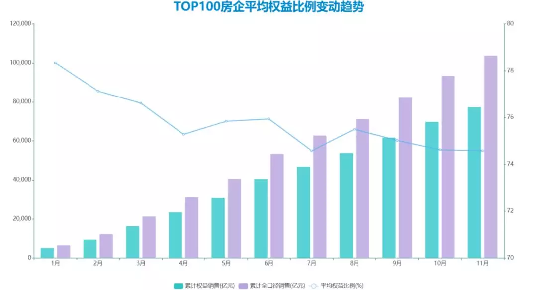 观点指数 观点指数发布的2019年1-11月房企权益销售金额TOP100榜单显示,1-11月,TOP100房企累计实现权益销售77430亿元,环比1-10月权益销售金额增长10.84%,平均权益比例为74.18%。