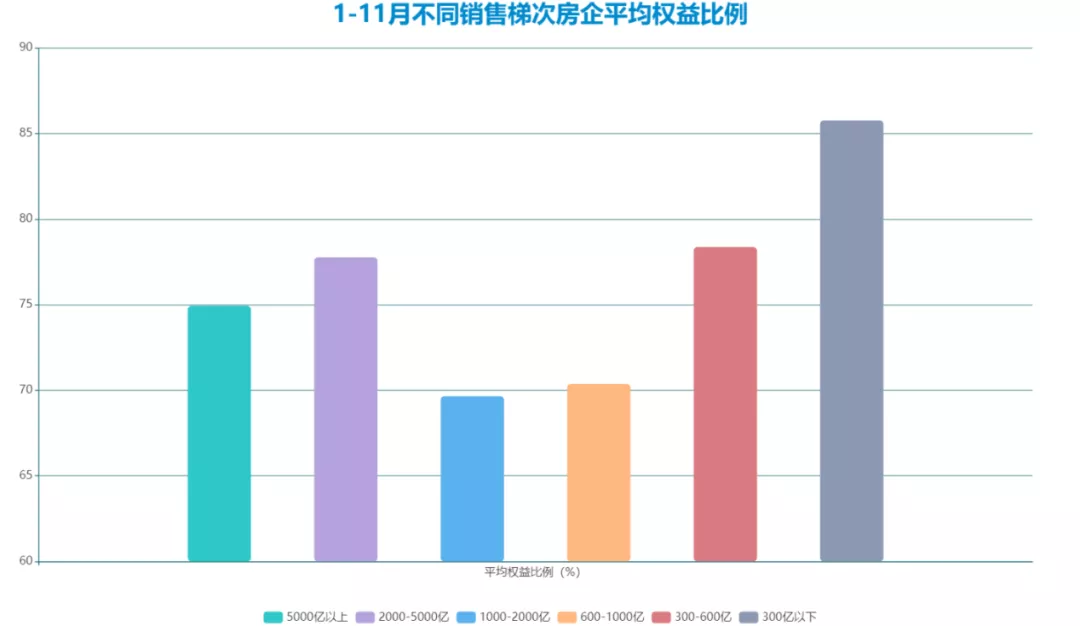 值得注意的是,不同于中大型房企,小房企的权益比例往往相对较高,其中全口径销售位于300亿元以下的房企平均权益在85%左右,远高于其他销售区间的平均权益比例。