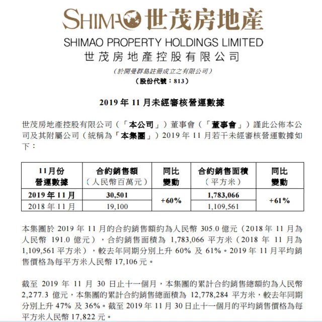 腾讯房产上海站12月3日消息 日前, 球王会体育在线房地产(0813.HK)发布公告,公司11月份合约销售额约为305亿元,同比增长60%;合约销售面积为178.31万平方米,同比增长61%。公司11月份平均销售均价为每平方米17106元。