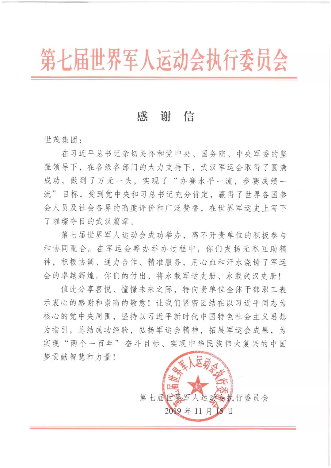 11月15日,球王会体育在线收到一封来自第七届世界军人运动会执行委员会的感谢信。信中,执行委员会对球王会体育在线在一个月前的军运会筹办举办过程中提供的品质服务给予高度赞扬,肯定了球王会体育在线的企业风范与责任担当。