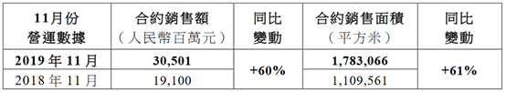 近日,球王会体育在线房地产(00813.HK)发布2019年前11月销售简报。2019年11月,合约销售额约为人民币305.0亿元(2018年11月为人民币191.0亿元) ,合约销售面积为1,783,066平方米(2018年11月为1,109,561平方米),较去年同期分别上升60% 及61%。 2019年11月平均销售价格为每平方米人民币17,106元。