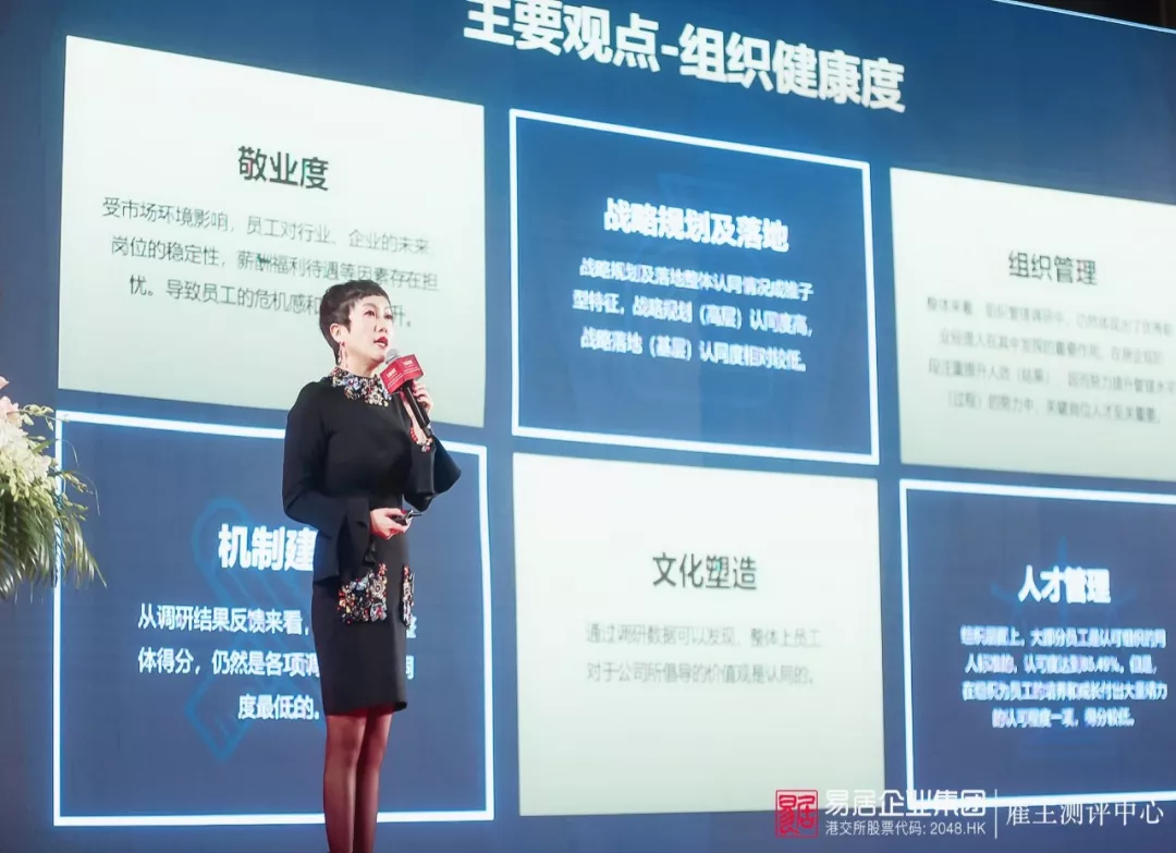 在中国房地产人力资源(第五届)发展年会上,易居企业集团人力资源服务板块雇主测评中心总经理、中国房地产业协会理事贾春晖女士在报告发布中,指出本次调研从战略规划及落地、组织规划、机制建设、文化塑造、人才管理、敬业度等各项因素的执行情况进行评价。