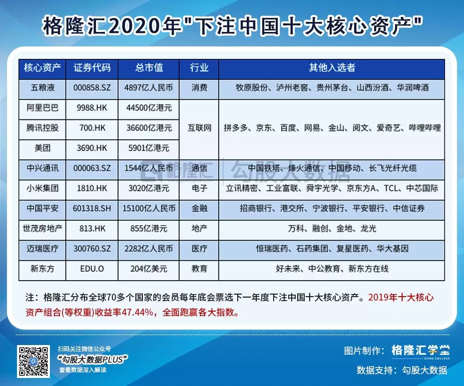 让我们先回顾格隆汇2019年十大核心资产的表现。2019年十大核心资产的全年回报率为47.44%,大幅跑赢了基准指数(沪深300指数,36.07%)。