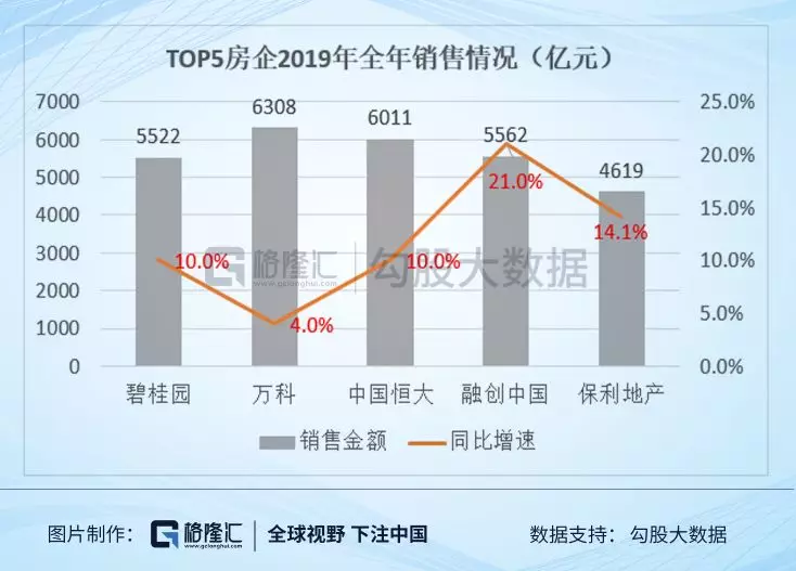 在第一梯队当中,2019年全年累计销售金额TOP5分别是万科,中国恒大,融创中国,碧桂园和保利地产。其中碧桂园5522亿元,同比增长10%;万科6308亿元,同比增长4%;中国恒大6011亿元,同比增长10%;融创中国5562亿元,同比增长21%;保利地产4619亿元,同比增长14%。