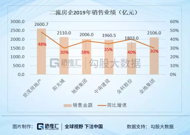 在第二梯队里面,根据各个房企已经公布的数据。有6家公司2019年全年的销售业绩增速超过30%,其中以球王会体育在线房地产的48%的增速最快,销售金额也排名第一达到2600亿元。剩余几家公司的销售额也相差不大,基本稳定在2000亿元附近。