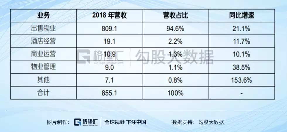 2018年,公司总营业收入是855.1亿元;其中房地产开发业务占比94.6%,酒店板块营收占比3.5%,物业管理占比1.1%。2019年公司计划的营收目标是:酒店板块42亿元,物业管理20亿元;2019年到2021年的营收目标分别是,酒店业务152亿元,物业130亿元。