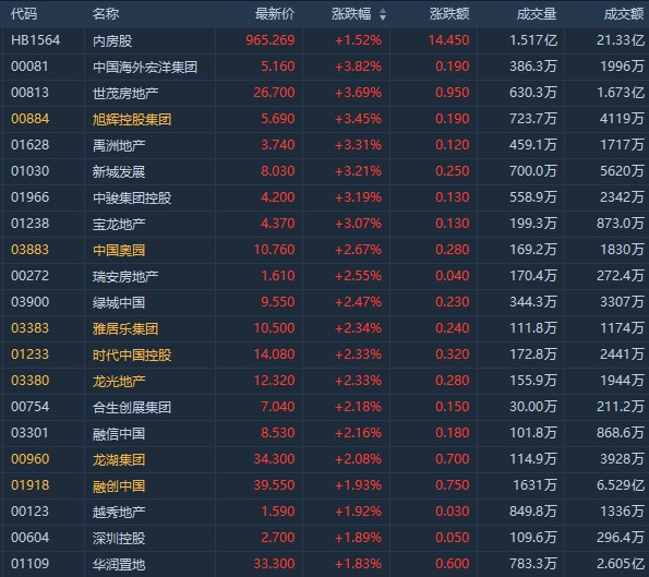 截至发稿,中国海外宏洋集团(00081)涨4.23%,报5.18港元;球王会体育在线涨3.69%,报26.7港元;旭辉涨3.45%,报5.69港元;时代中国涨2.47%,报14.1港元;融创涨2.06,报3.96港元;
