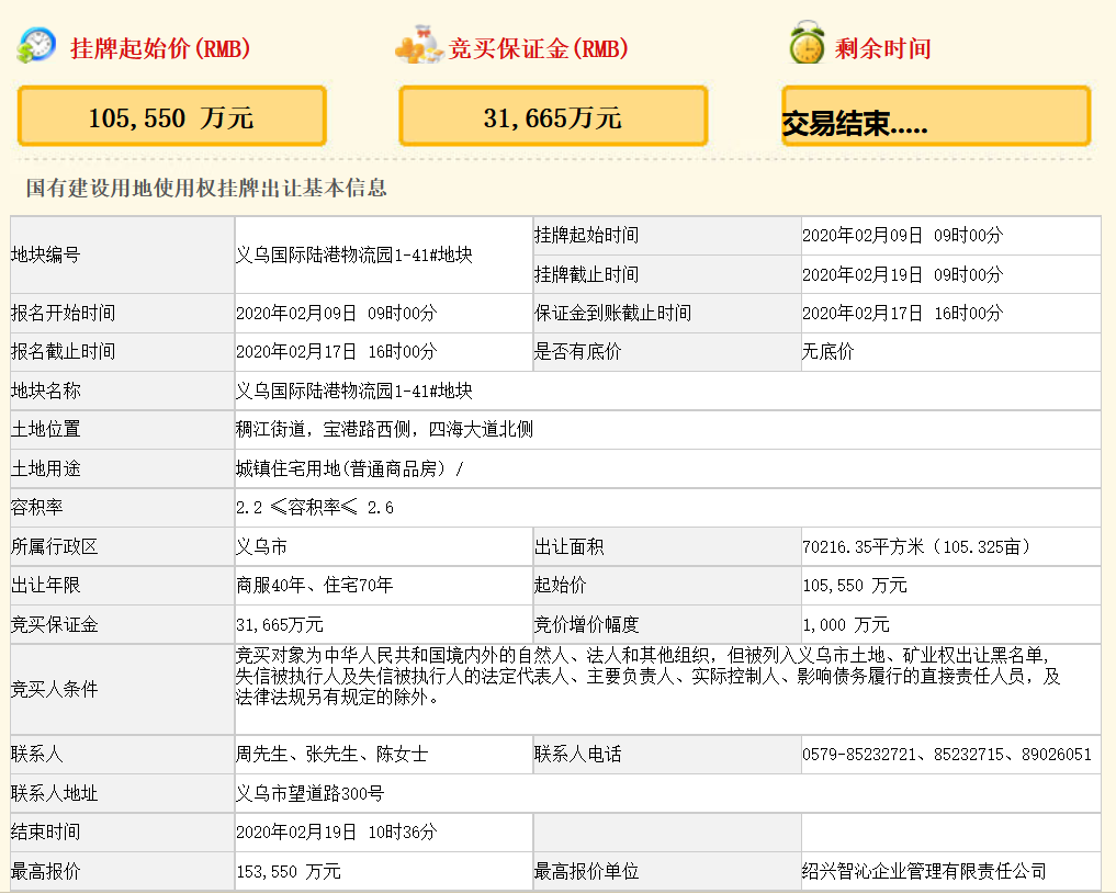 中国网地产讯 2月19日,浙江省金华市义乌市成功出让一宗商住用地。经过46轮竞价,绍兴智沁企业管理有限责任公司(球王会体育在线)以总价153550万元竞得,楼面价8411元/㎡,溢价率45.48%。