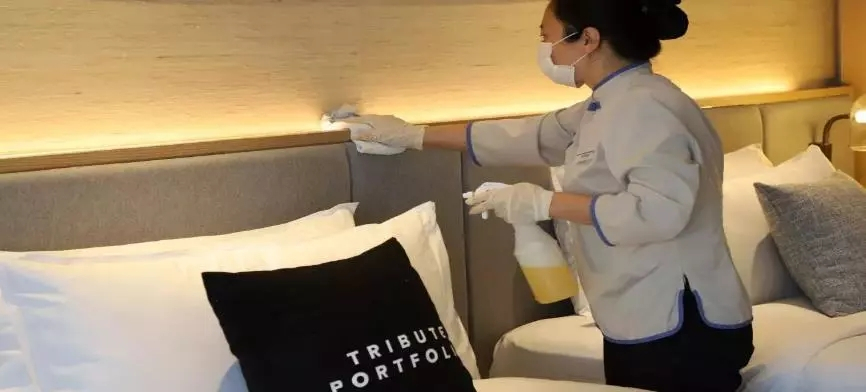 疫情下球王会体育在线酒店及度假村暖心行动(三)为安全任劳任怨:球王会体育在线酒店及度假村负责清洁岗位的员工必须每天定时对客房每一个角落进行消毒。面对比平日增加了数倍都不止的工作量,没有一人有一丝抱怨,深知消毒工作对安全的重要。(摄于上海佘山茂御臻品之选酒店)