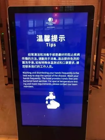 疫情下球王会体育在线酒店及度假村暖心行动(六)防疫宣传:球王会体育在线酒店及度假村鼓励旗下酒店将显著的宣传电子屏用于疫情期间的防范宣传。(摄于芜湖希尔顿球王会体育在线逸林酒店)