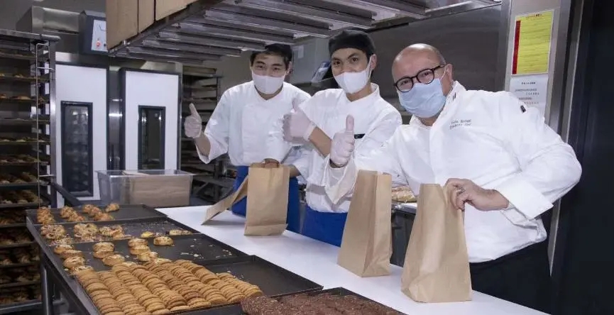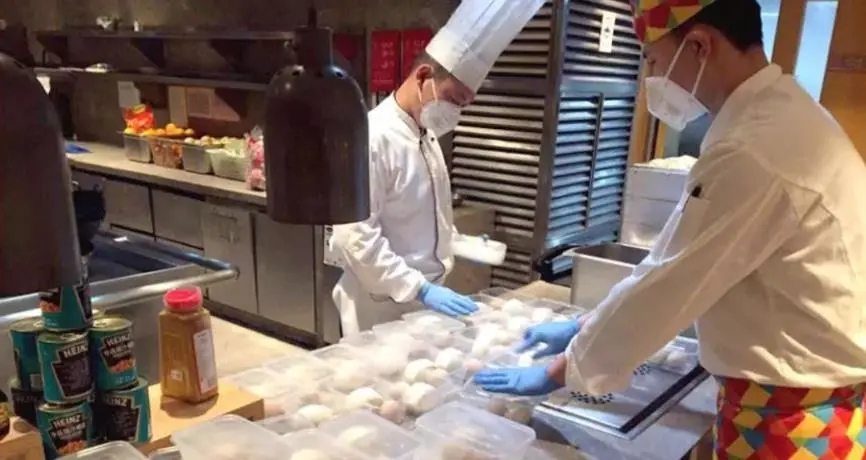 疫情下球王会体育在线酒店及度假村暖心行动(九)给一线送点“甜”:为了能够让医护人员吃到热腾腾的点心,上海佘山球王会体育在线洲际酒店西饼房团队清晨就开始了精细的制作工作。