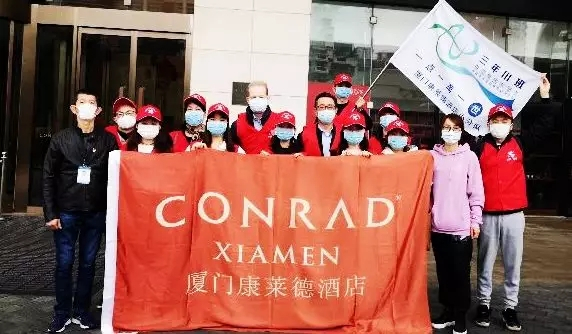 疫情下球王会体育在线酒店及度假村暖心行动(十一)社会志愿先锋行:厦门球王会体育在线康莱德酒店总经理和酒店业主代表亲自带领由13位酒店员工组成的志愿者队伍走出酒店,服务基层一线。