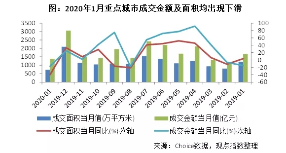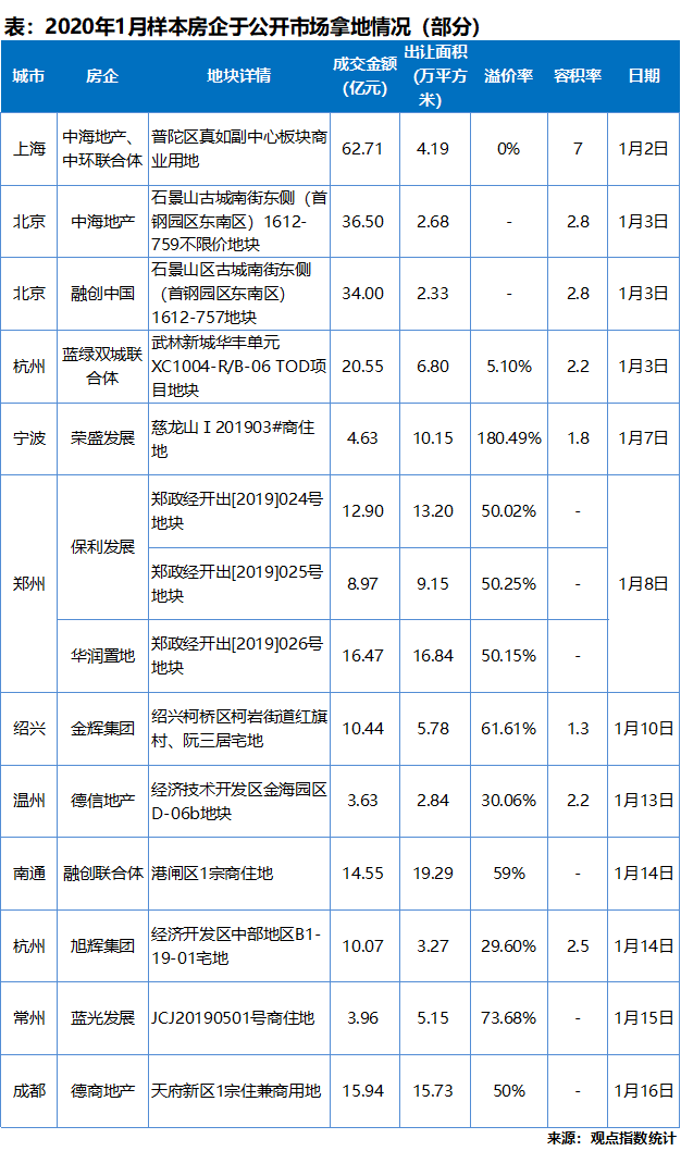 据观点指数研究院不完全统计,2020年1月样本房企在公开市场拿地成交金额合计超过465亿元,成交面积超过270万平方米,环比增长分别超过16%和8%。