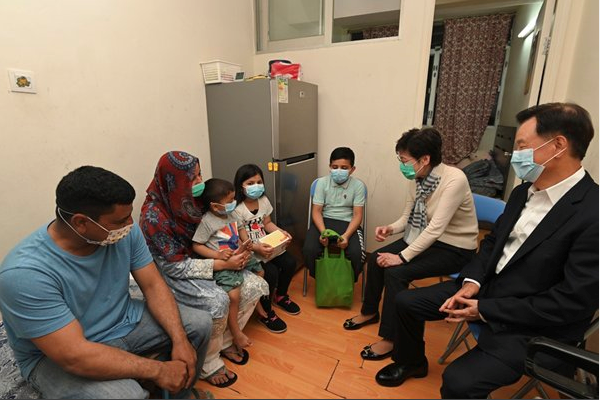 行政长官林郑月娥今日到油尖旺区探访少数族裔基层家庭,向他们派发口罩、少数族裔语言健康资讯单张和其他日用品。
