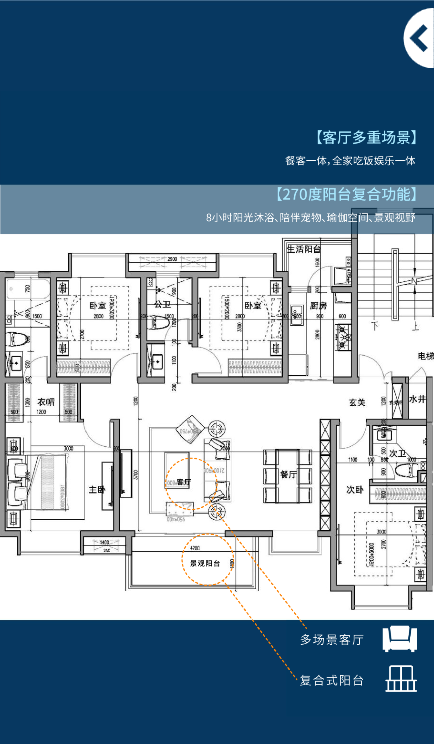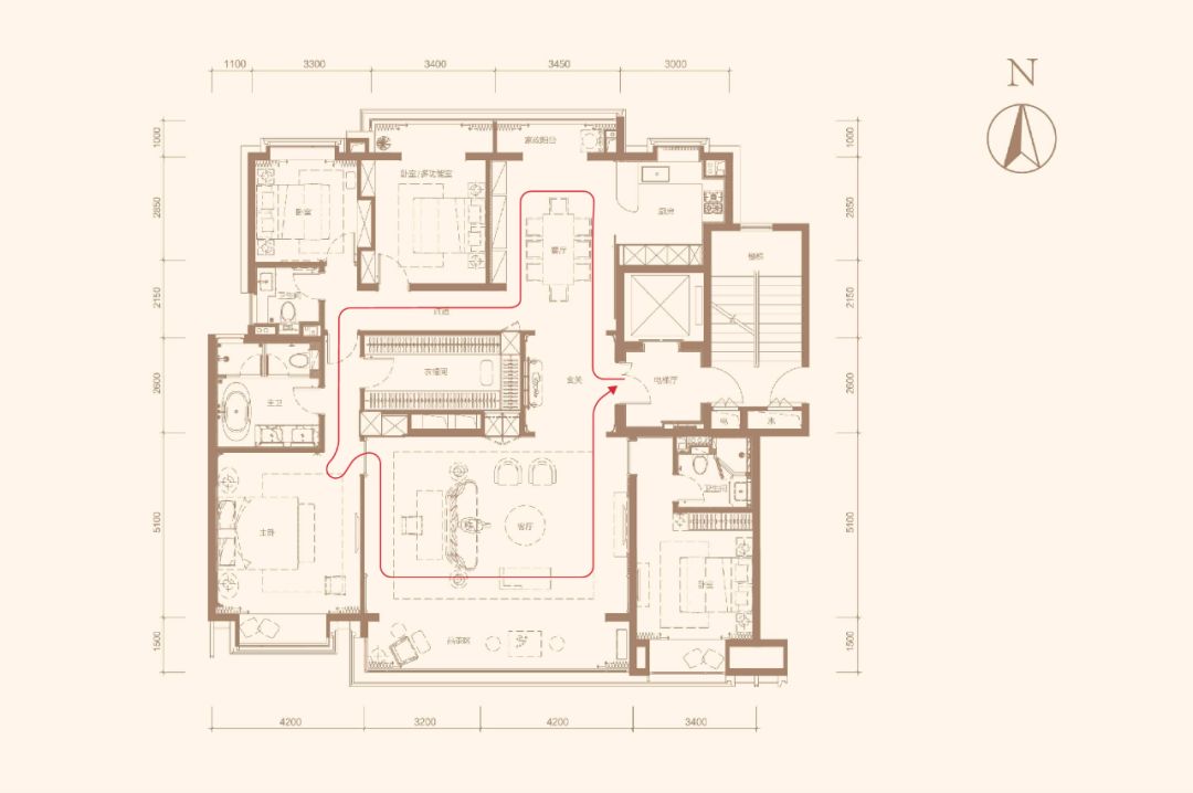 比如下图中的郑州北龙湖金茂府198㎡户型,就拥有这样的回游动线。