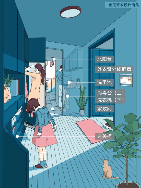 球王会体育在线标准化「抗疫新品」中的玄关,设置了中转空间,与家政区结合,有通风有洗漱,可放置消毒用品,可紫外线杀菌,还有足够的空间放置未来得及处理的外部物品。