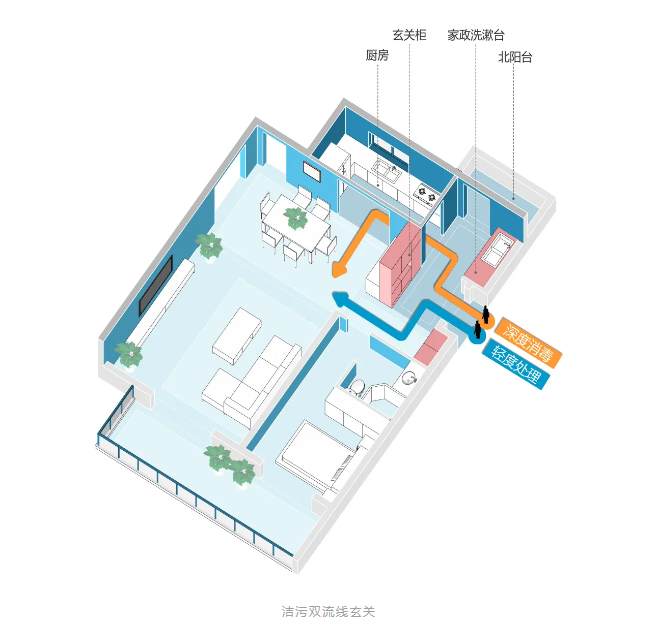 设置两条入户流线,一条“轻度处理”流线,如果只是短时间出门,简单消毒、收纳外套后,就可以沿着这条线路步入客厅;一条“深度消毒”流线,适合长时间外部活动后的清洁需求,沿着这条线路,流水洗手,外衣直接拿到北阳台上晾晒或清洗,不必带着脏衣上的细菌穿越客厅。