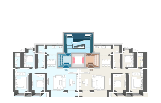 轻松形成动线、区域分离,各区域之间兼具私密与 互动性;家人在家可以充分互动,客人、家庭服务人员则不会进入主人私密区域。