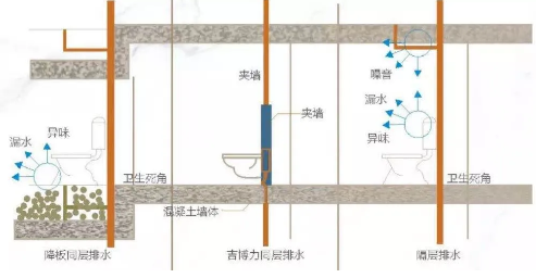 金茂很多项目的卫生间采用吉博力同层排水技术,便器挂墙安装,管道上下层不穿越楼板。