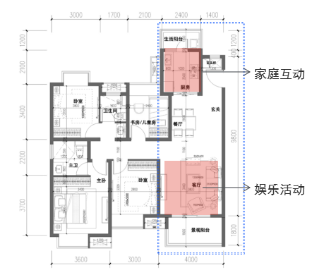 了解到客户对于居住空间的娱乐和心理需求,蓝光把“心理健康”维度纳入到了户型设计的考量层面,不管是厨房还是客厅,从一开始就放大了两者的比例,让家人可以有更多的时间在一起,也让空间衍生出了更多的场景。