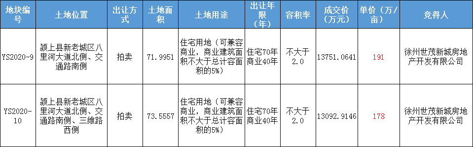 金科 地产摘得颍上YS2020-11、YS2020-12两宗地,共计128.54亩。总价约2.45亿,11号地块单价191万/亩 ;12号地块单价190万/亩。信息如下: