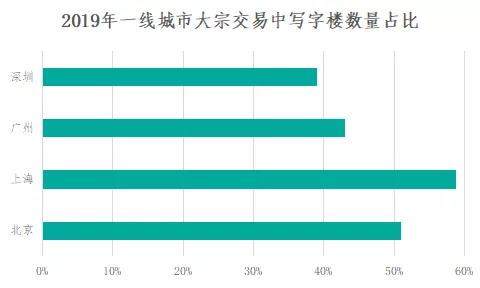 2019年我国一线城市的大宗交易较为活跃,据世邦魏理仕数据显示,北上广深一线城市大众交易物业中,以写字楼为主的商办物业占据很大比例,其中上海的写字楼交易数量占比最多,为58.8%,其次是北京为51%,而广州和深圳也在40%左右。