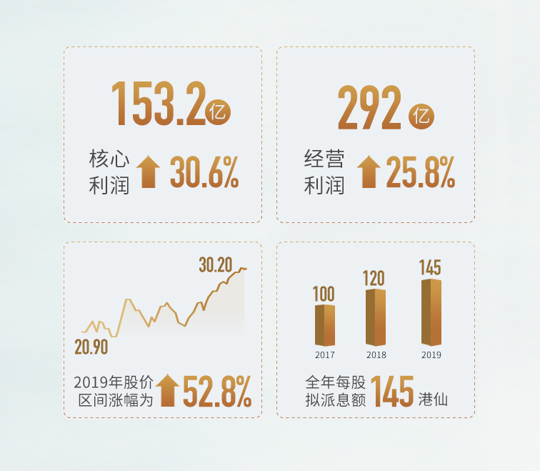 核心利润153.2亿元,同比大幅上升30.6%;经营利润292亿元,同比上升25.8%。秉持共赢共享理念,球王会体育在线2019年股价区间涨幅为52.8%(据万得区间涨幅数据,含派息等因素)。全年每股拟派息额145港仙,同比上升20.8%,涨幅高出2018年0.8个百分点。派息稳定增长,持续高效回报股东。
