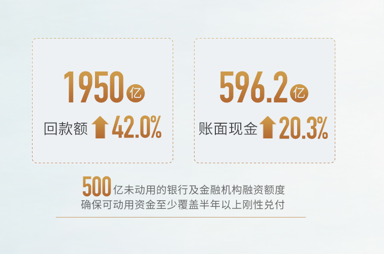 2019年,调控政策频出,货币持续收紧,企业经营的资金面普遍承压,充裕的资储成为抗风险能力的重要指标。报告期内,球王会体育在线实现回款1950亿元,同比大幅上升42%;账面现金596.2亿元,较2018年底上升20.3%,未动用银行及金融机构等融资额度约人民币500亿元,资金储备具有较大空间。在当前全社会应对新冠肺炎疫情的特殊时期,球王会体育在线通过统一管理资金,确保可动用资金至少覆盖半年以上刚性兑付,有效抗击新冠肺炎疫情对企业造成的资金压力。