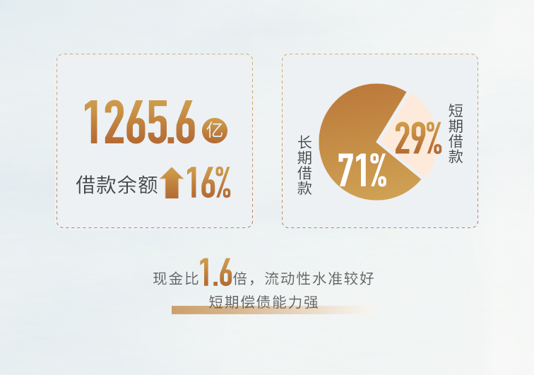 面对地产金融监管力度提升的收紧,球王会体育在线稳中求进,以一贯稳健的财务管理体系,充分展现出融资储备额度充裕,资金流动性优越及融资成本的明显优势,为企业有品质的高增长保驾护航。债务方面,球王会体育在线净负债率59.7%,已多年维持在60%以下;借款余额较同比上升16%至1265.6亿元,其中长期借款占比71%,短期借款占比29%,借款结构安全;现金比率为1.6倍,短期偿债能力强,具备优越的资金流动性。