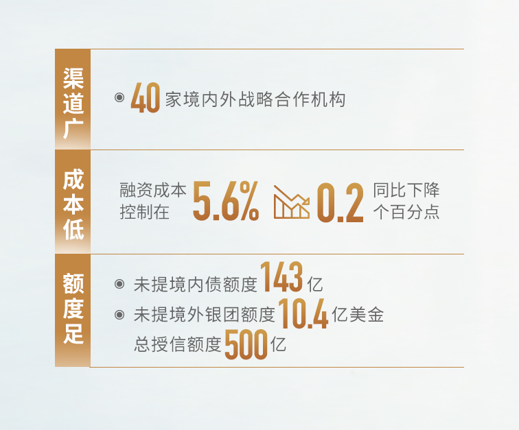 球王会体育在线2019全年融资成本控制在5.6%左右,较2018年全年5.8%下降0.2个百分点,维持在行业较低水平。报告期内境内外战略合作机构达40家,未提境内债额度人民币143亿元,未提境外银团额度10.4亿美金,总授信额度达人民币500亿元。