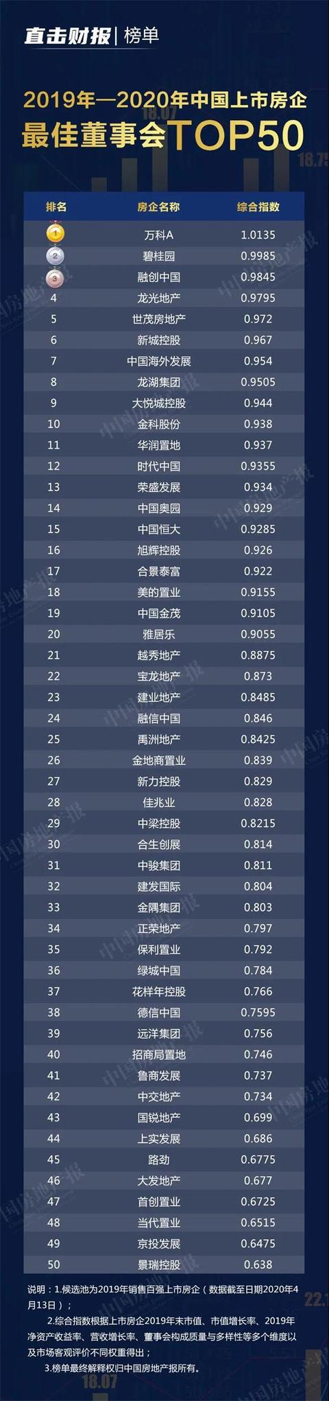 “2019年—2020年中国上市房企董事会TOP50榜单”以2019年销售百强上市房企为候选池,并根据上市房企2019年末市值、市值增长率、净资产收益率、营收增长率、董事会构成质量与多样性等多个维度以及市场客观评价不同权重得出榜单排名。