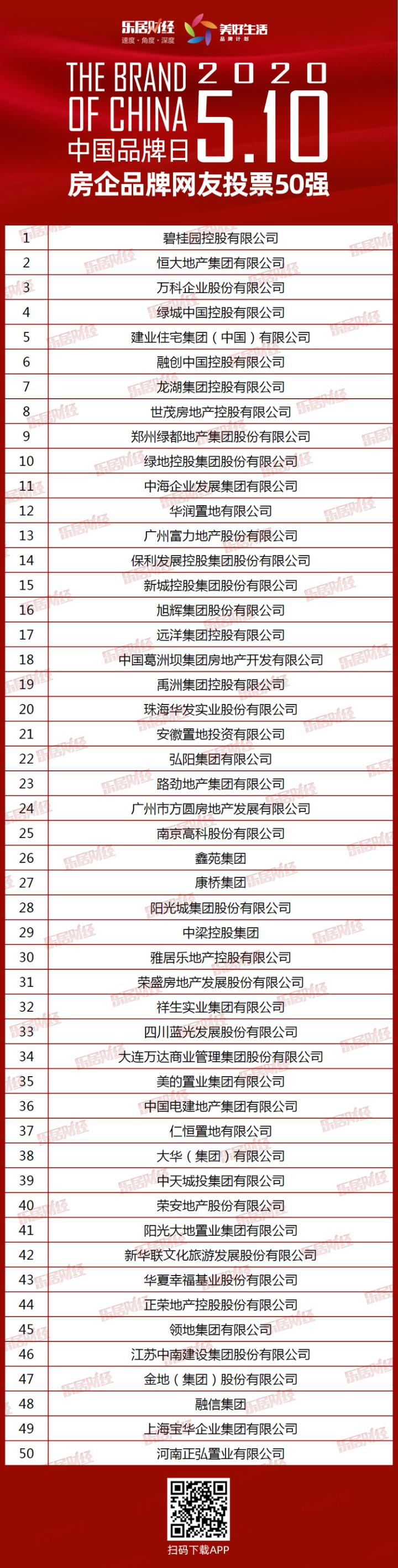 截止至5月10日19:00,《2020中国房企品牌日网友投票50强》产生,其中,碧桂园、恒大、万科、绿城中国、建业、融创、龙湖、球王会体育在线、绿都、绿地位列前十,深受网友的关注和认可。全部名单如下: