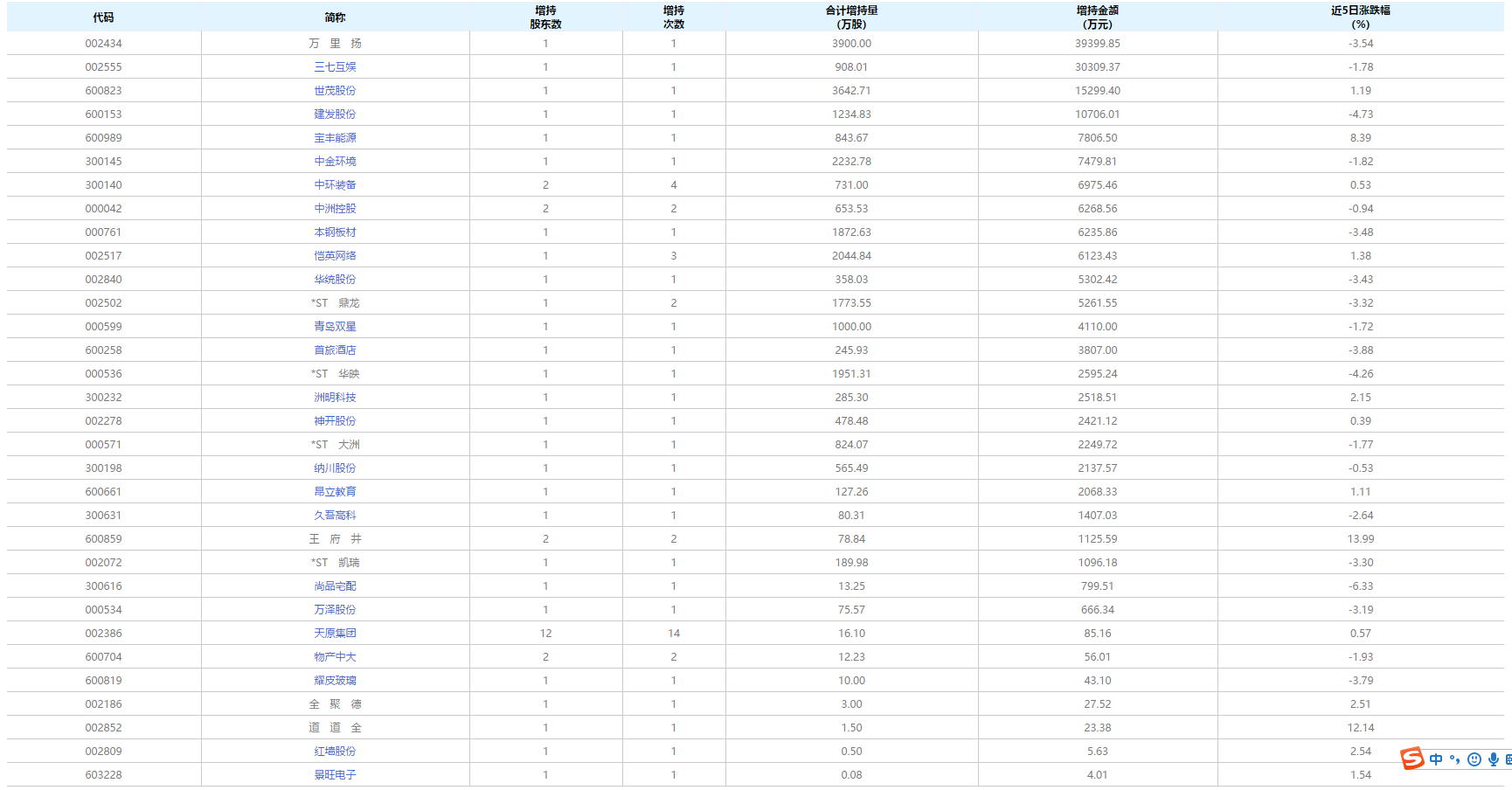 从增持金额看,近5日增持金额在5000万元以上的有12家,增持金额最多的是万里扬,期间累计增持3900.00万股,增持金额合计3.94亿元;其次是三七互娱,增持量为908.01万股,增持金额3.03亿元;球王会体育在线股份近5日获股东增持1.53亿元,增持金额位居第三。