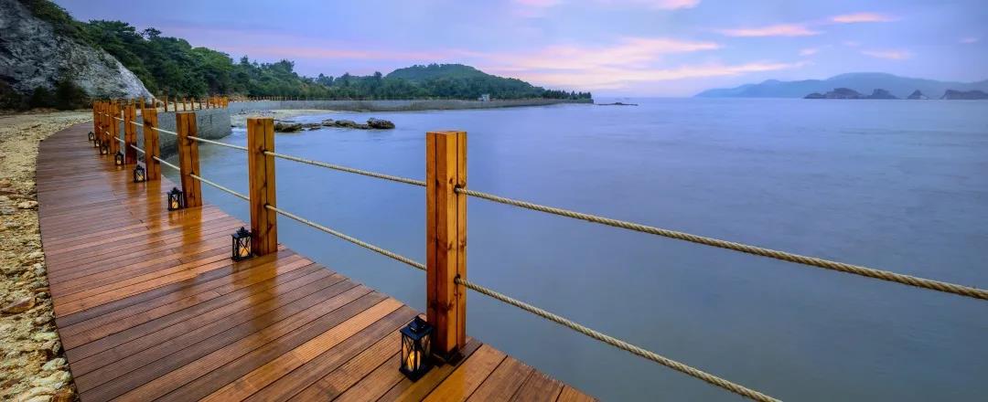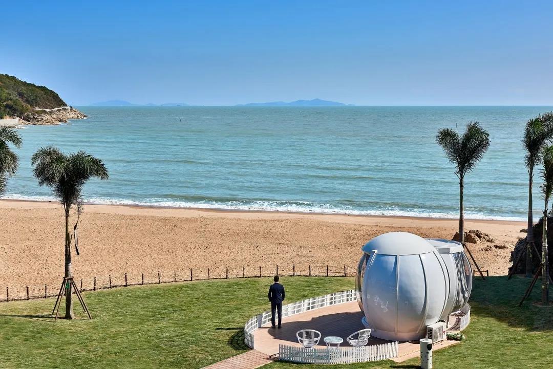 建筑、沙滩、海面和五虎礁共同构成唯美画卷