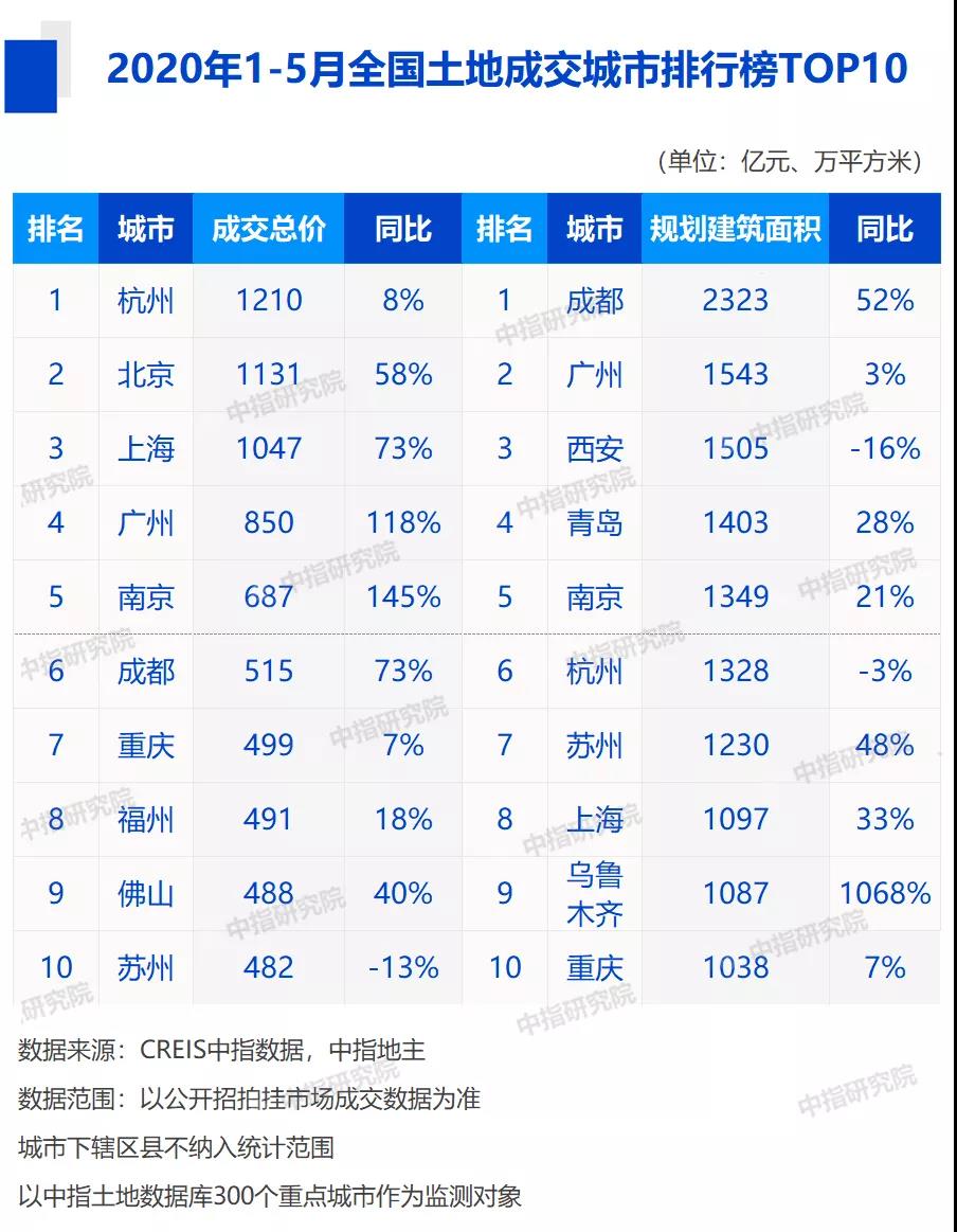 从城市排行榜来看,一二线城市仍是房企拿地重点,长三角区域部分城市土地成交涨幅度较大。2020年1-5月,全国土地成交金额TOP10城市总计成交7400亿元,较去年增长42.5%;规划建筑面积TOP10城市成交13903万平方米,同比增长25.1%。其中,杭州以1210亿元的成交总价位于榜单首位,北京和上海分别以1131亿元和1047亿元的成交总额占据榜单第二、三位。规划建筑面积方面,成都以2323万平方米稳居榜首,广州和西安分别以1543万平方米和1505万平方米紧随其后。值得关注的是,二线城市南京、成都增速分别为145%、73%,增速明显加快,一线城市中广州增幅较大;成交规划建筑面积中占据榜首的成都较去年同期增长52%,乌鲁木齐、苏州增幅较大,分别同比增长1068%、48%。