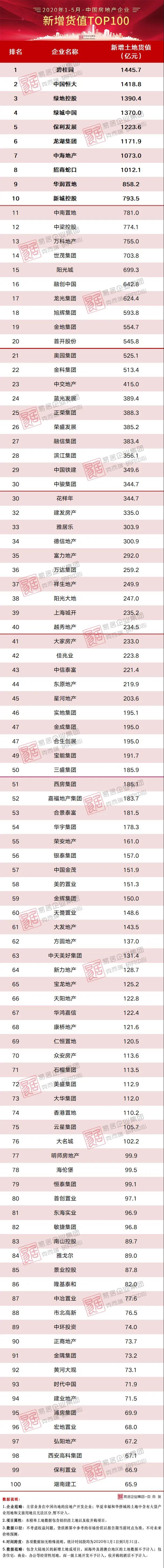 克而瑞地产研究6月3日发布了2020年1-5月中国房地产企业新增货值TOP100排行榜,榜单中指出:5月份土地市场延续了4月回暖趋势,整体量价稳中有升,长三角、珠三角核心城市土地吸引多家开发商激烈竞拍,平均溢价率实现五连涨。