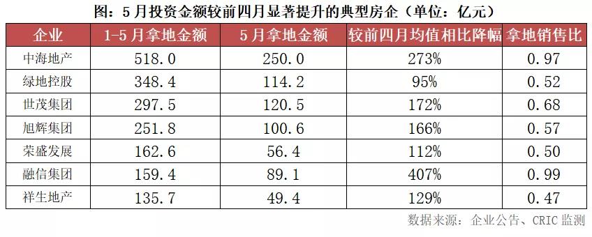 单月来看,5月超过六成销售TOP50房企拿地金额较1-4月份显著提升,中海、球王会体育在线等规模房企投资金额超百亿。而此前拿地积极的房企如绿城、中梁等投拓脚步略有放缓。