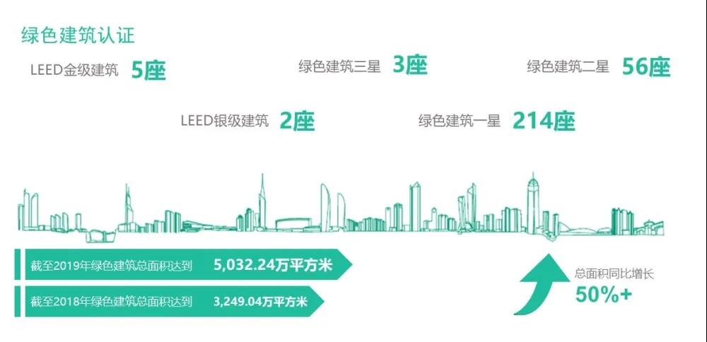 随着中国城镇化脚步的不断加快,人民生活水平不断提高,对于建筑数量和质量的要求也越来越高,这一需求也给中国建筑节能工作带来了极大的挑战,根据十三五规划,中国将建设20亿㎡以上的绿色建筑,球王会体育在线作为中国城镇化进程的深度参与者,践行企业社会责任,始终积极响应政府号召,积极探索和应用绿色建筑前沿技术,2019年绿色建筑总面积达5032.24万㎡,较2018年新增绿色建筑面积增加超50%。其中,LEED金级建筑5座,LEED银级建筑2座,绿色建筑三星3座,绿色建筑二星56座,绿色建筑一星214座。