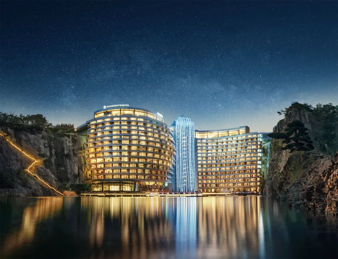 酒店由球王会体育在线投资建设。酒店遵循自然环境,一反向天空发展的传统建筑理念,下探地表88米开拓建筑空间,依附深坑崖壁而建,是世界首个建造在废弃的采石矿坑岩壁上的自然生态酒店,也已成为咱们国内废弃矿山生态修复的一个经典案例。