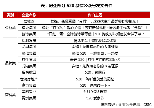 在5月众多节日中,房企也热衷于520告白节,可以维护与客户、合作伙伴、业主等“亲密”关系,深入人心的树立品牌形象。从表白内容上看,大致可归为公益类、品牌类、营销类,既有直抒胸臆告白城市、客户的,也有含蓄委婉的举办公益活动、购房活动、展示社区、宣传产品等,从表白形式上看,有小视频、海报、文字、互动游戏等方式。