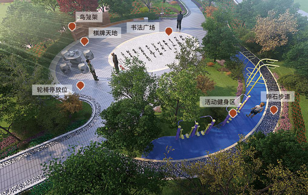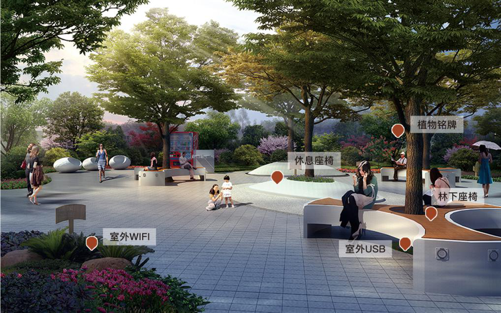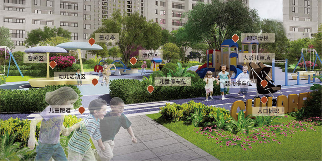 多园,指的是四季无忧的全龄健康园林。根据对不同年龄段居住者的生活习惯与特性的研究,搭建满载一生幸福的园林关怀体系。包含成长系儿童娱乐场地、多功能活动空间、林下书吧等场景。