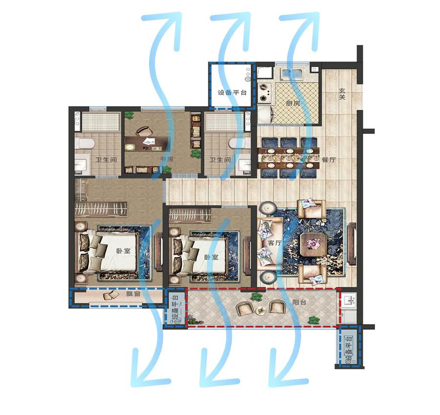 从大面宽采光到传统南北通透和风道对流设计,让阳光铺满室内。每当早晨自然醒来后拉开窗帘,和煦的阳光倾撒进房屋,整个家都焕醒了活力。