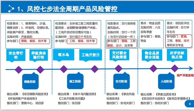 又如绿地江西事业部的风控七步法,从销售阶段开始把控沙盘、销售物料说辞、红线内外不利因素,到了施工阶段跟进工程进度、组织工地开放日,组织交付阶段扫楼、交付前联合风险检查等,交付后继续跟进维保、进行项目后评估及缺陷反馈等等,一连串的动作下来,形成了风险管理动作闭环。
