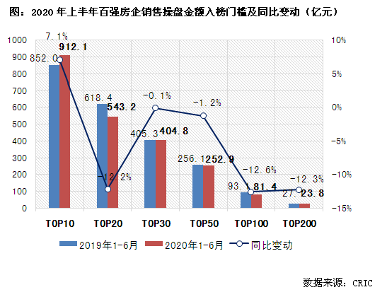 一方面,2020年上半年,TOP10房企销售操盘金额入榜门槛增加7.1%至912.1亿元。而除TOP10房企外,截至6月末百强房企各梯队销售金额入榜门槛仍同比降低。