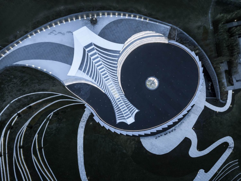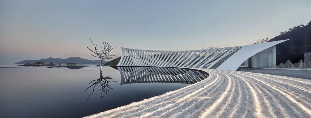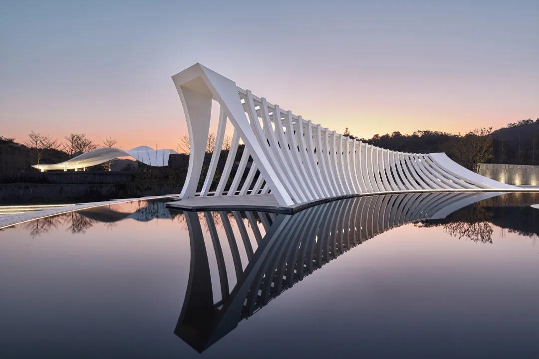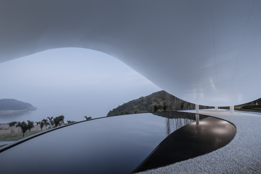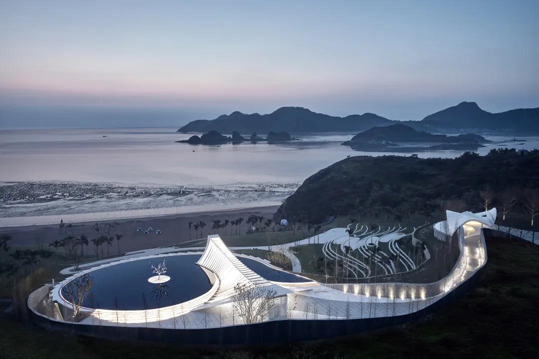 整个建筑通过读形构象,取景融情的手法,观海听涛,寻找建筑与大海间的共鸣。建筑主体空间形成一个圆盘状的基座,两边起伏的等高线汇聚,和原始的陡坡浑然一体。圆盘顶部的镜面水景上,排列有序的构架向外伸展,宛若一只向阳展翅高飞的海鸥,结构骨感柔韧,构建了建筑的纯净空间,也给人一种强烈的视觉冲击。